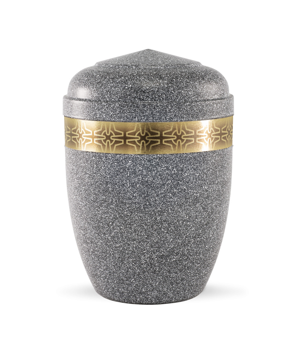 Ez a különleges fém urna bazalt hatású lakkozott felülettel készül, amely erőt és méltóságot sugároz. A testet körbefutó, kereszt motívummal díszített rézszínű szalag teszi teljessé, amely a keresztény hit örök szimbólumát emeli ki.