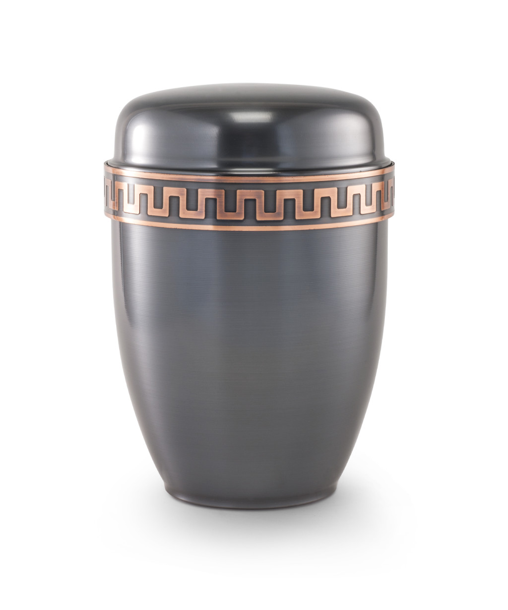 Ez a rézből készült urna sötét, elektropolírozott (galvanizált) felületet kapott, amelyet antik hatású, körbefutó réz meander motívum díszít. A klasszikus görög ornamentika formavilága méltóságot és időtlen harmóniát kölcsönöz a darabnak.