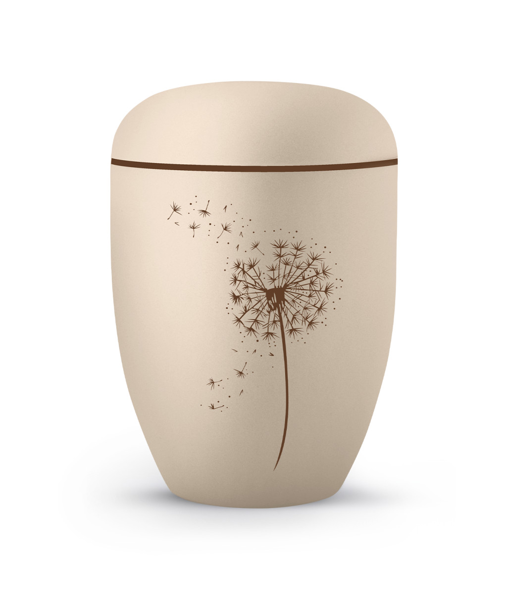 Az Edition Classique – 4060 urna a múlandóság és az emlékek továbbélésének jelképe. Bársonyos krém színű felületét barna pitypang motívum díszíti, amely a szabadságot, a lélek útját és a természet örök körforgását szimbolizálja. Természetes, lebomló anyagból készült, így környezetbarát és méltóságteljes választás a hamvak elhelyezésére.