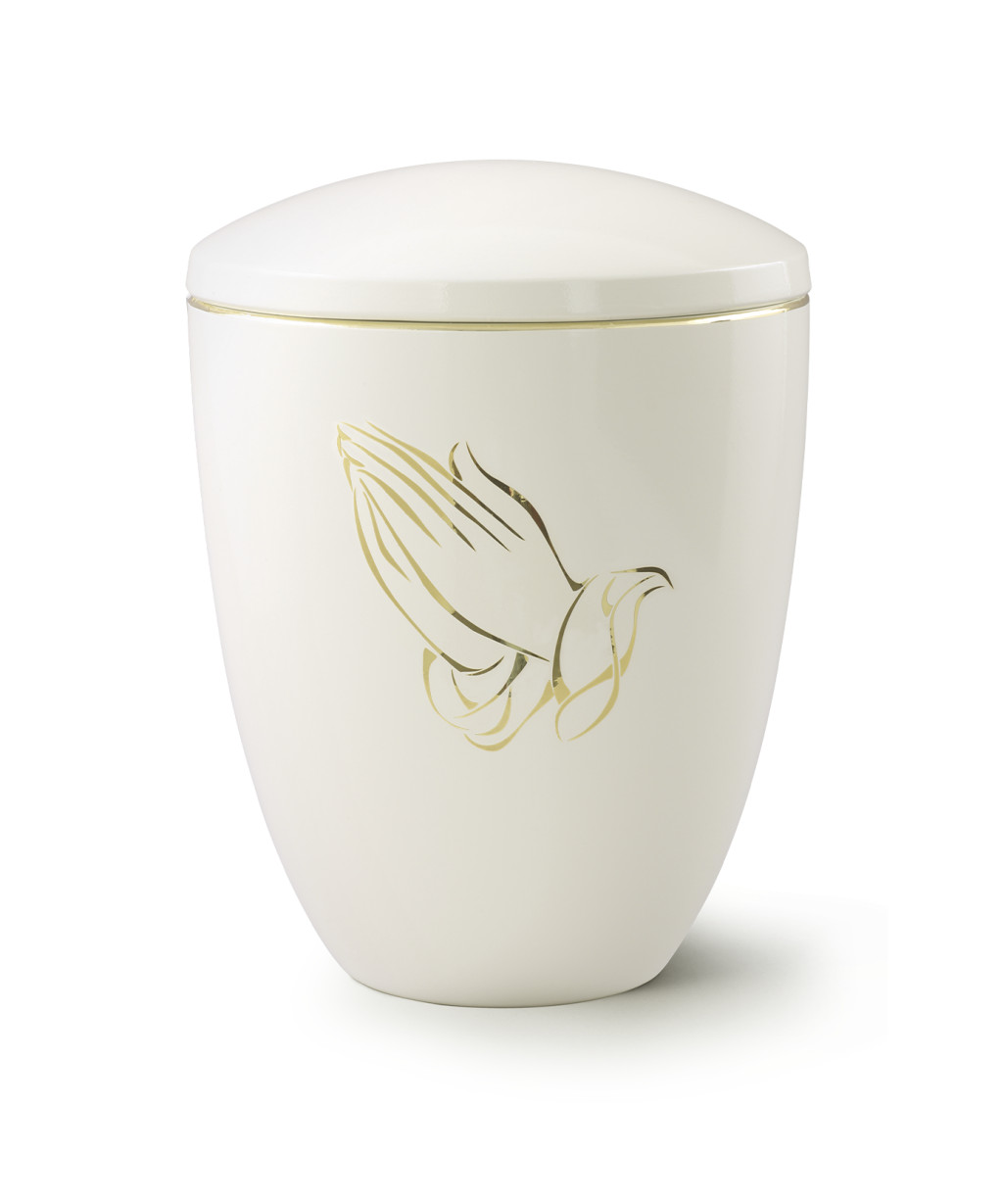 A világos elefántcsontszínű, csillogó kerámia urna elegáns megjelenését finoman polírozott aranyszínű perem, valamint Albrecht Dürer híres „Imádkozó kezek” művének stilizált arany motívuma emeli ki. Ez az ikonikus jelkép a hit, az Istenbe vetett bizalom és az elhunytért mondott könyörgés szimbóluma.