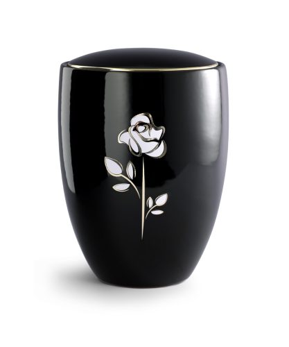 Ez az elegáns kerámia urna a Ceramica kollekció része, mélyfekete, fényes mázas felülettel és kézzel polírozott arany peremmel. A testet aranyszínű rózsa motívum díszíti, amely az örök szeretet, a szépség és a tisztaság szimbóluma.