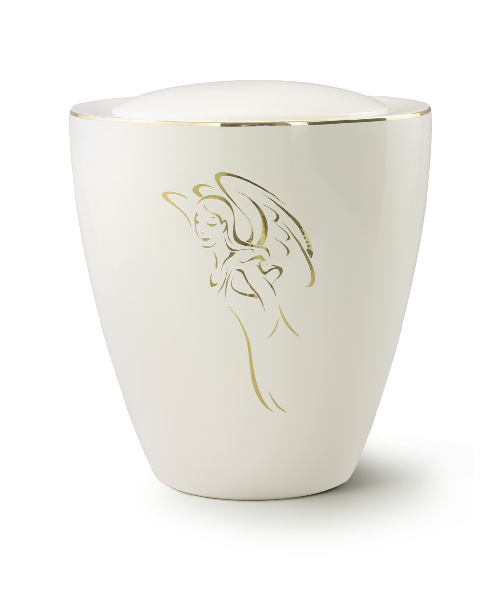 6430EN-G kerámia urna elefántcsont színű fényes felülettel, arany angyal motívummal temetéshez