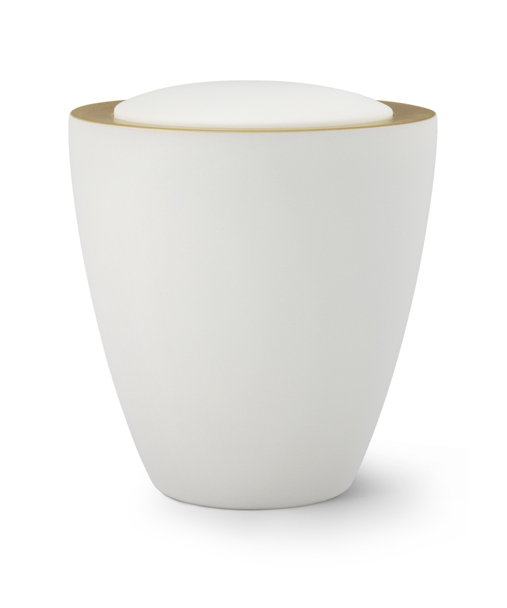 6484 kerámia urna bársonyos fehér felülettel, aranyszínű díszcsíkkal temetéshez