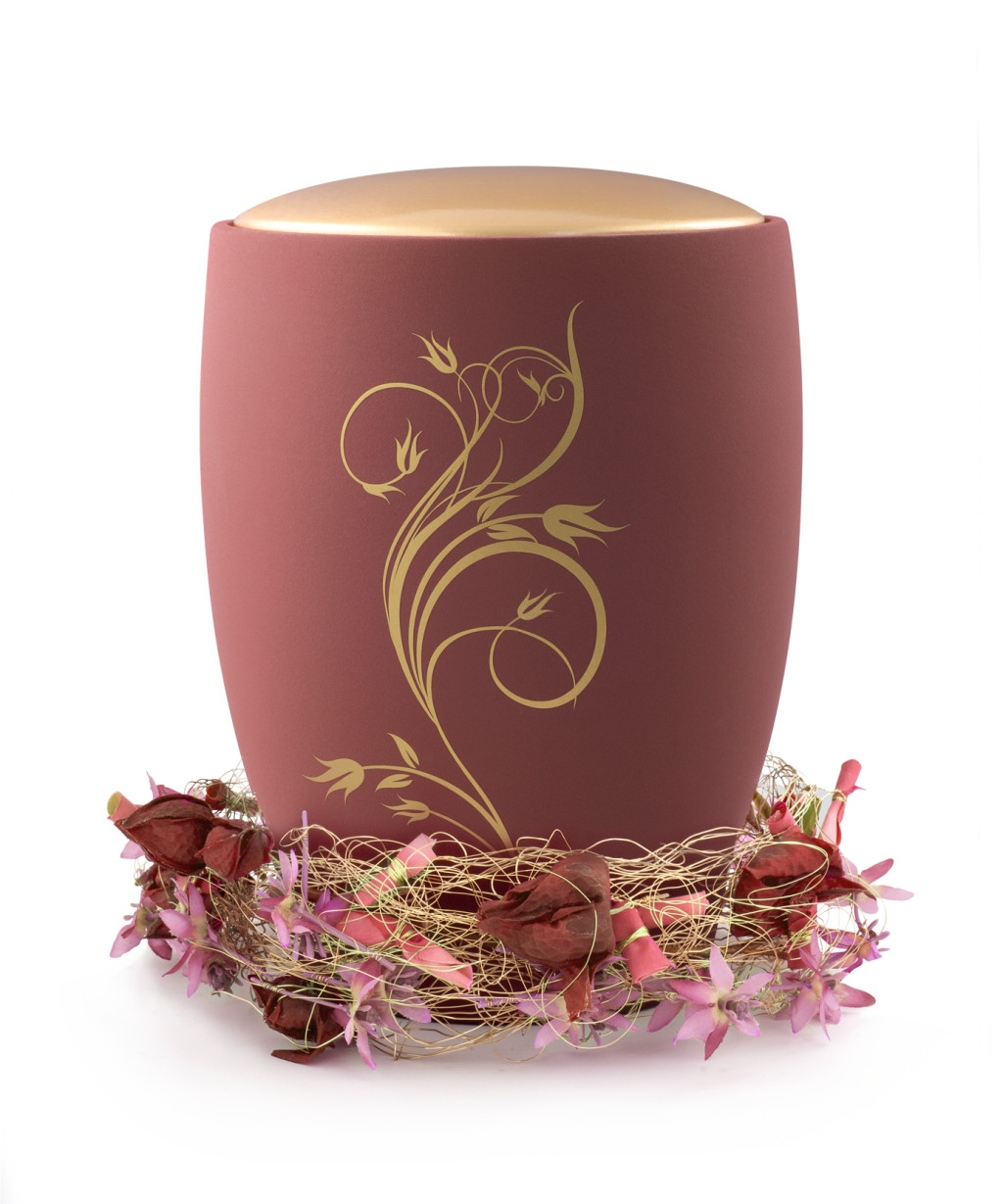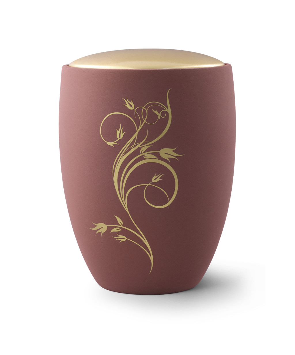 A Remember Me kollekció vörösbarna árnyalatú urnája egyesíti a melegség és méltóság érzését. A bársonyos felület és a kézzel festett arany tető időtlen eleganciát sugall, miközben a matt arany virágindás díszítés a természet finom szépségére emlékeztet.
