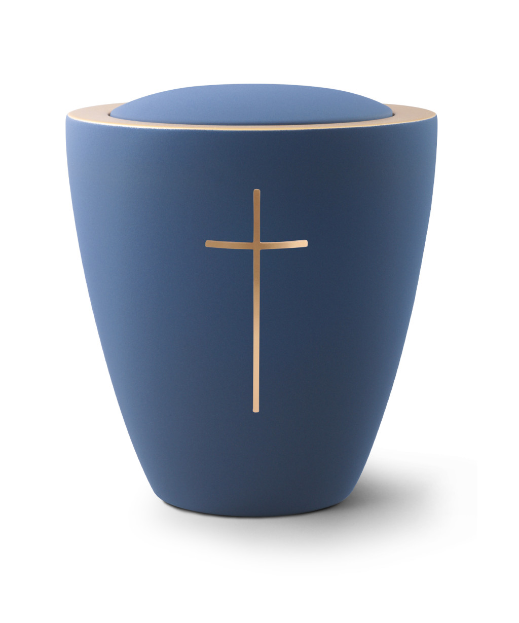 A kereszt a hit, a remény és a feltámadás örök jelképe. Jézus kereszthalálára és a halál feletti győzelemre emlékeztet, így különleges jelentéstartalommal ruházza fel ezt az urnát. A tengerkék szín bársonyos felülettel párosul, amelyet elegáns aranyszínű perem és matt sárgaréz kereszt egészít ki – méltóságteljes és spirituális választás egy szeretett személy búcsúztatásához.
