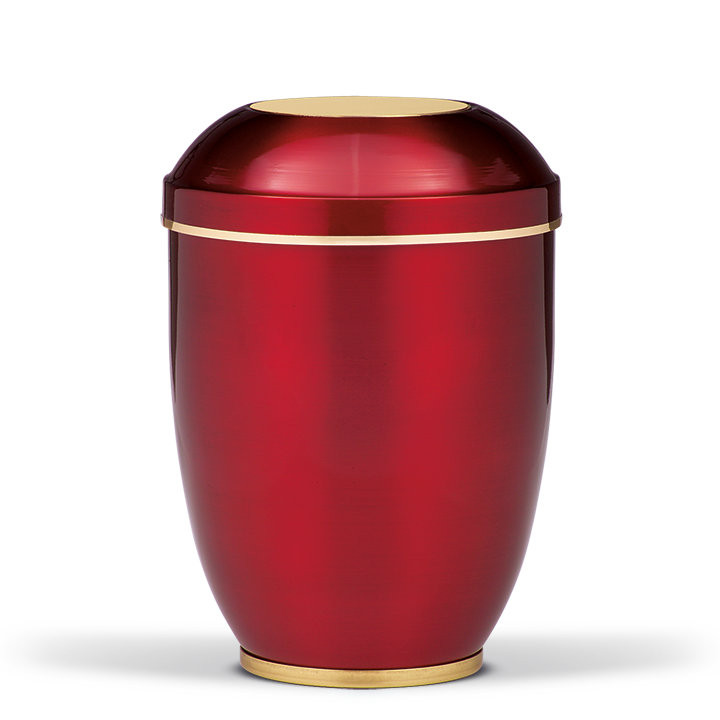 Acélból készült urna bordó színű felülettel. Az arany színű díszítőgyűrű, a fedélbe illesztett sárgaréz elem és a polírozott talprész elegáns, letisztult megjelenést biztosít.