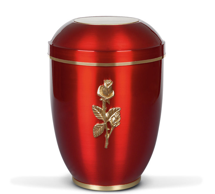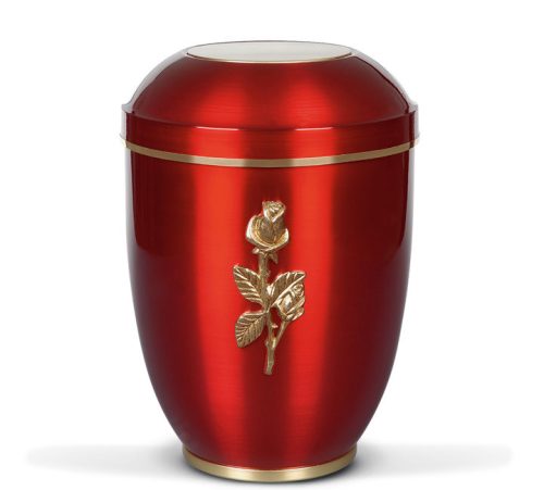 Acélból készült urna bordó színű felülettel. Az elülső oldalon elhelyezett rózsa ág motívum, az arany színű díszítőgyűrű és a polírozott talprész elegáns, klasszikus megjelenést biztosít.