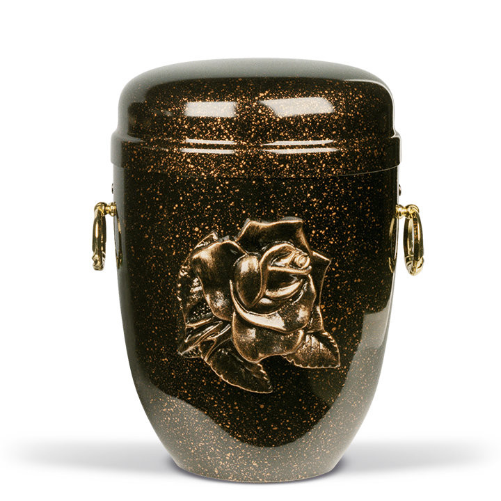Acélból készült urna fekete, magasfényű felülettel, finom rézszínű, szemcsézett hatású díszítéssel. Az urna elején elhelyezett hangsúlyos rózsa motívum klasszikus, időtálló megjelenést biztosít, míg az oldalsó díszítő elemek és a részletgazdag kialakítás elegáns összhatást adnak.