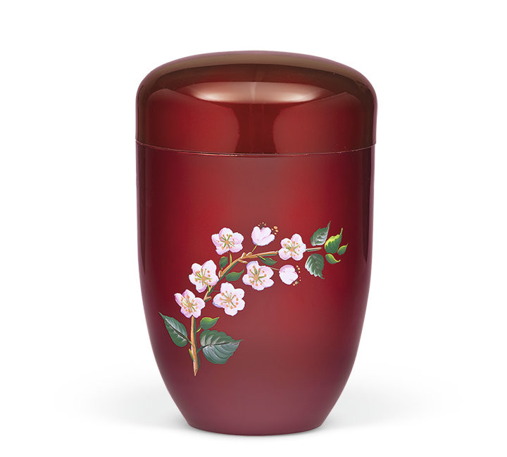 Acélból készült urna bordó színben, finoman kialakított felülettel. Az urna oldalán kézzel festett virágmotívum jelenik meg, amely részletgazdag kidolgozásával egyedi és személyes megjelenést biztosít.