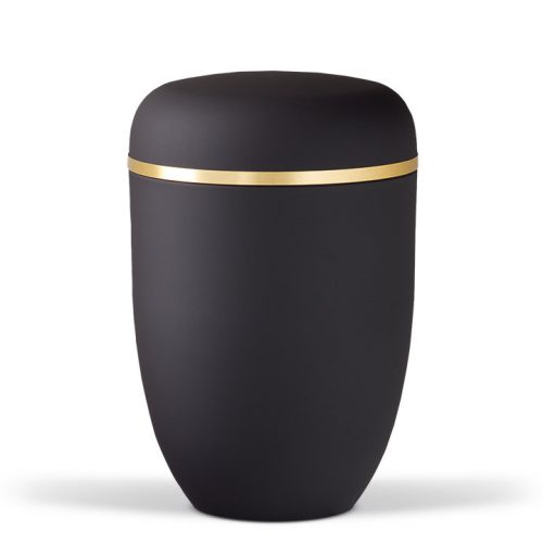 Acélból készült urna antracit színben, matt hatású, visszafogott felülettel. Az urna díszítését egy körbefutó, finoman megmunkált arany szalag adja, amely elegáns kontrasztot teremt, letisztult és időtálló megjelenést biztosítva.