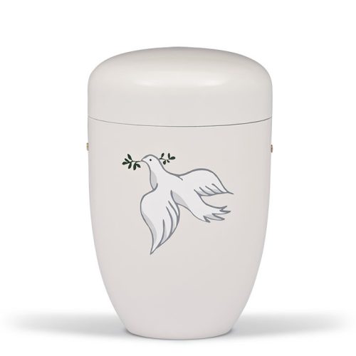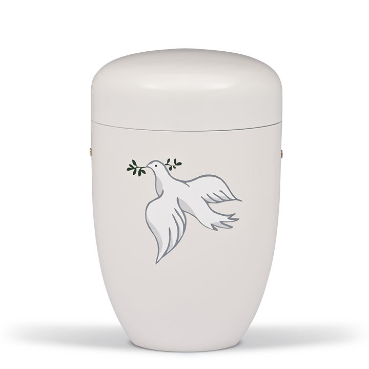 Acél urna krémfehér színben, letisztult felülettel. Az előlapon galamb motívum olajággal jelenik meg, visszafogott és szimbolikus megjelenéssel.