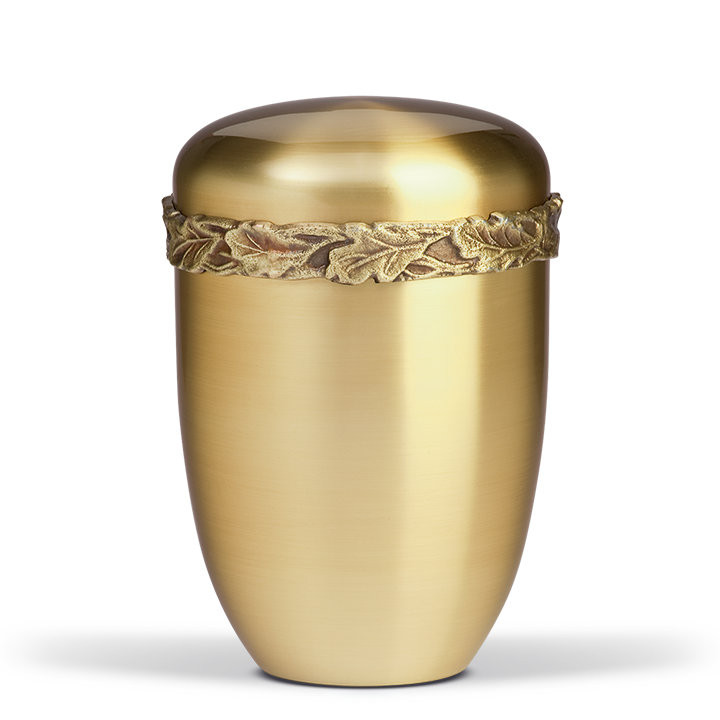 Arany színű, sima felületű réz urna, felső részén körbefutó tölgyfalevél frízzel. Letisztult forma, hangsúlyos növényi motívummal.