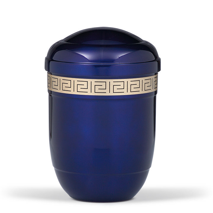 Kobaltkék színű acél urna fényes felülettel, klasszikus formával és meander díszítőmintával. Letisztult, visszafogott megjelenésű emlékurna.