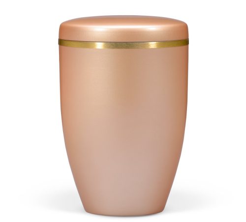 Barack árnyalatú, finoman selymes hatású felületű acél urna arany díszítőszalaggal a fedélen. Letisztult, világos megjelenésű emlékurna.
