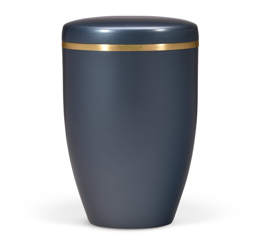 Kék színű, gyöngyház hatású felületű acél urna arany díszítőszalaggal a fedélen. Letisztult, visszafogott megjelenésű emlékurna.