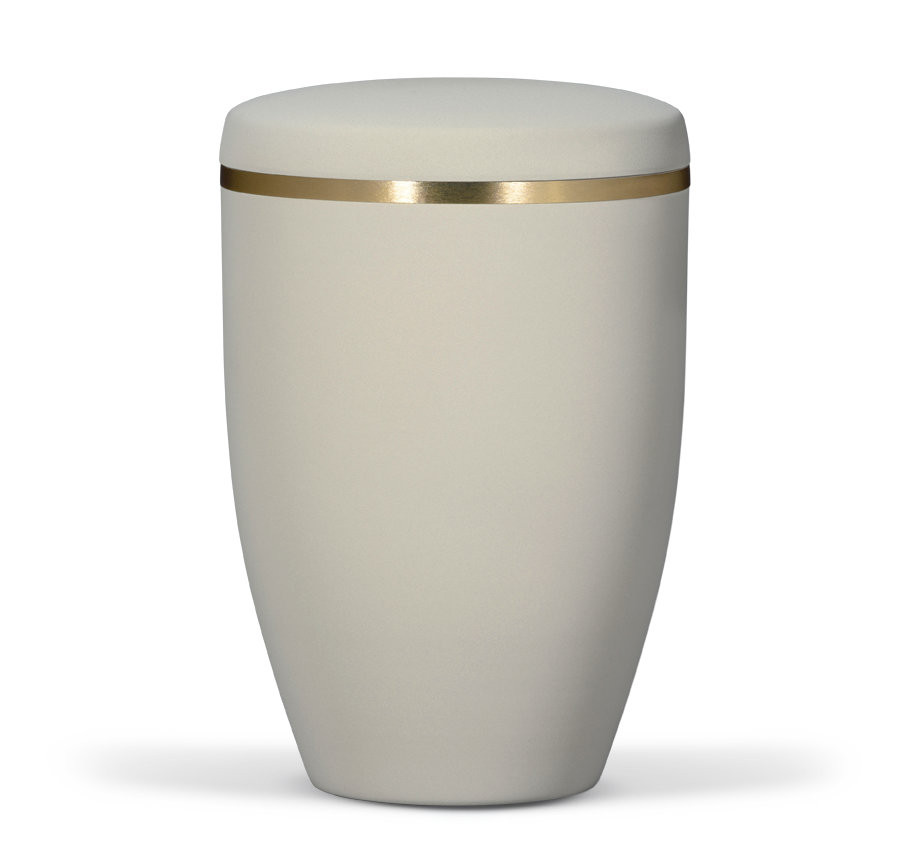 Bézs színű, bársony hatású felületű acél urna arany díszítőszalaggal a fedélen. Letisztult, világos megjelenésű emlékurna.