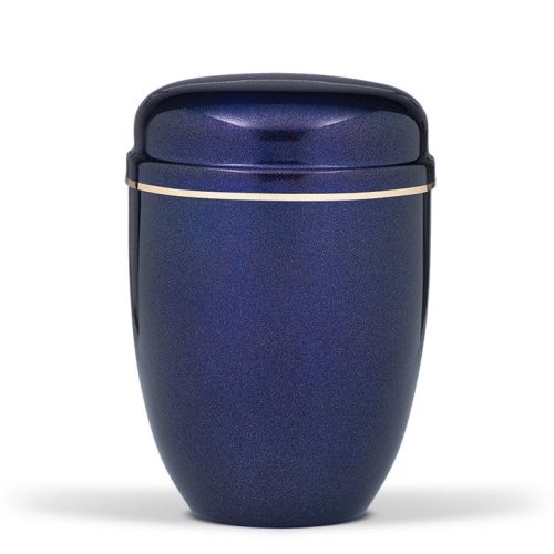 Kobaltkék színű acél urna gyöngyház hatású felülettel és arany szalag díszítéssel. Letisztult, visszafogott megjelenésű kivitel.