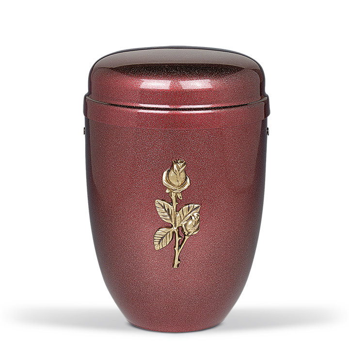 Bordó színű acél urna gyöngyház hatású felülettel és arany rózsa motívummal. Letisztult, visszafogott megjelenésű kivitel.