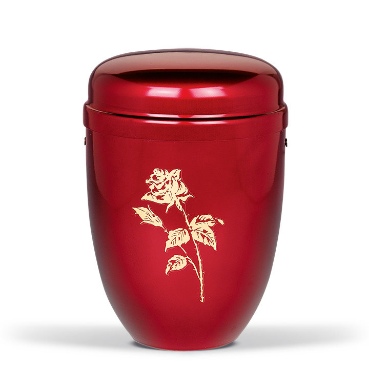 Bordó színű acél urna arany rózsa motívummal. Letisztult, klasszikus megjelenésű kivitel.