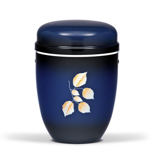 Kék színű acél urna visszafogott fekete patinás hatással, finom levél motívummal és ezüst szalag díszítéssel. Letisztult, harmonikus megjelenése méltóságteljes emléket képvisel.