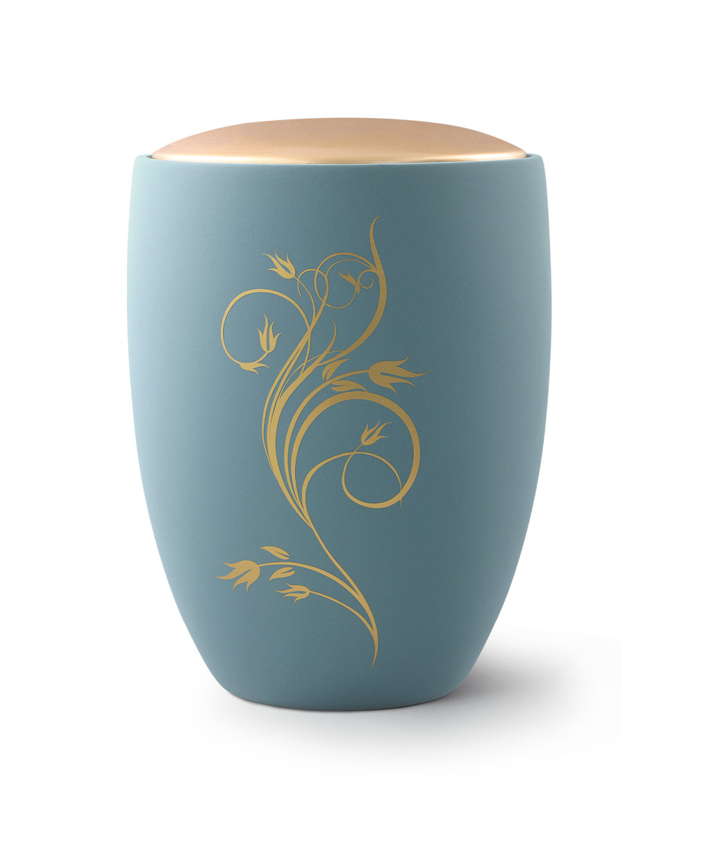 A türkiz szín nyugtató hatása és az arany virágindás díszítés elegáns összhangban állnak ebben a Remember Me kollekcióhoz tartozó urnában. A bársonyos felület lágy fényt ad a kerámiának, míg a kézzel festett arany tető és a matt arany virágdekoráció méltóságteljes és modern megjelenést biztosít.